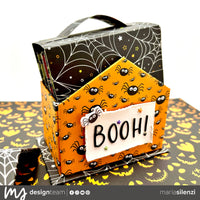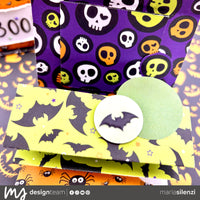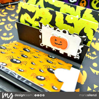 Ho creato e rivestito la casina con la carta Halloween 1 e 2, mentre per il mini album ho usato anche la carta Halloween 3 e una monocromatica nera che trovate nel pad “color palette mini basic colors”.