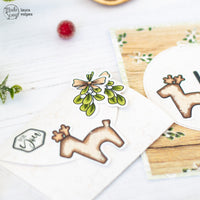 Per il porta gift card ho usato la fustella *Gift Card Holder*. L'ho decorata con immagini dal set *Forever Green* e con il *Fluffy in Old Linen*, che ho usato per glassare la rennina.