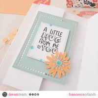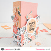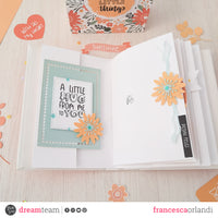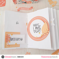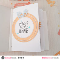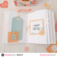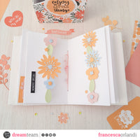 Per decorare la copertina e le pagine ho usato la carta Double Side nei vari colori Pastel Yellow, Pastel Peach, Pastel Blue, Pastel Green, Pastel Tiffany e le fustelle Dashing Circles, Dashing Rectangles e Dashing Squares abbinate alle relative fustelle Creative Circles, Creative Rectangles, Creative Squares. Ovviamente non potevano mancare i bellissimi fiori del set di fustelle “Happy Flowers”, e anche la fustella “Spring Greenery”. Per il journaling ho usato il set di timbri “Hug Me”.