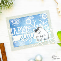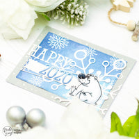 Per il sentiment ho utilizzato la *Funny Alphabet* e ho anche creato un banner con le fustelle *Banner*. Ho fustellato le lettere da del cartoncino bianco e ho sfumato Distress Oxide in Stormy Sky e Faded Jeans sui numeri che formano 2020.