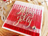 Nella card rossa con la campanellina, la fustellata Holly Jolly (in carta argento specchio) è incollata su una base interamente ricoperta di frange, realizzate sempre con la collezione Christmas Italian Style (ho scelto le fantasie rosse) e il Vellum Foil Hexagons Holographics. Secondo me la fustellata Holly Jolly risalta benissimo!