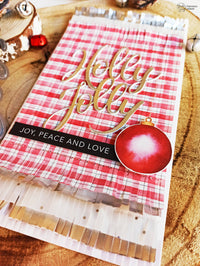 Ho voluto che la card con la pallina di Natale e la scritta “Joy, Peace and Love”, assomigliasse ad una coperta perciò ho usato la fantasia tartan della collezione *Christmas Italian Style* e ho messo le frange alle due estremità (fatte con il nuovo *Vellum Foil Hexagons Holographics* e il cartoncino *Argento Specchio*). Infine ho incollato la fustellata argento Holly Jolly. Sembra un pò una coperta oppure la vedo solo io!?