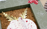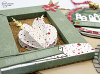 Sfruttando la collezione Limited Edition Xmas LE e le nuove fustelle natalizie ModaScrap, ho creato una cornice con lo sfondo in sughero da appendere all'entrata e all'interno ho creato una sfera tridimensionale con le fustelle Dashing Circles; un tocco di carta dorata per creare le foglie e una piccola stella di natale sul lato della cornice.