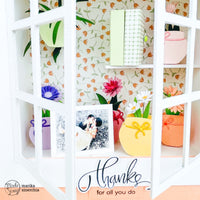 Sulla mensola ho posizionato due mini mini album per i quali ho usato la patterned *Wild flowers n.4*. Infine, per lo stile del layout, il font del set di timbri *Thanks* mi sembrava perfetto!