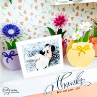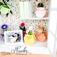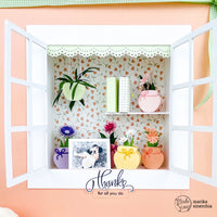 I vasetti colorati sono realizzati con la fustella del set *Bee sweet* nei colori *Pastel yellow*, *Pastel rose*, *Pastel peach*, *Pastel purple*, *Pastel mauve*, *Pastel green*. I fiori sono realizzati con le parti più piccole delle fustelle *Echinopsis flowers* e *Zinnia flowers*; la pianta nel vaso sospeso fa sempre parte del set Echinopsis flowers.