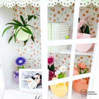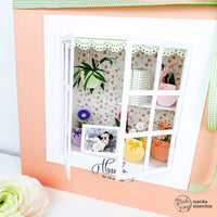 La finestra misura 15 x 15 cm, le due ante 6,5 cm di larghezza x 13 cm di altezza. Per creare il layout all’interno della finestra, ho costruito (sempre con il cartone vegetale da 1 mm) una scatola che misura 13,5 x 13,5 x 5 cm di profondità e ho rivestito la parte centrale con la *Wild flowers n.5*.