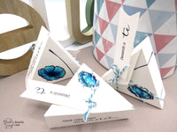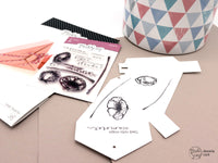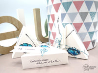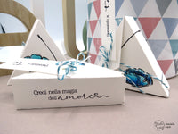 Partendo da un bazzill bianco ho fustellato la Triangle Box che ho decorato con un set di timbri. In questo caso ho utilizzato il set coi tulipani che mi fa impazzire e, oltre ai fiori, ho usato le scritte per arricchire il laterale della scatola.