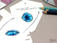 Ho colorato i tulipani usando le Prismacolor e ho scelto le tonalità del blu perché volevo qualcosa di veramente diverso dal solito. Ho creato anche una piccola tag aggiungendo la scritta “Pensando a te”, ho assemblato il tutto e questo è il risultato che ho ottenuto.