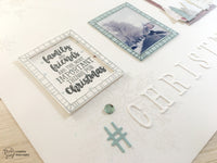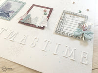Per il Layout invece sono partita da una base di Woodstock bianca, ho creato uno sfondo con i bellissimi fiocchi di neve di Tommy, timbrando con Versamark ed embossando a caldo con clear embossing powder. Mi piace molto l’effetto tono su tono.