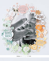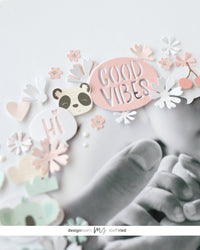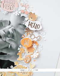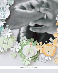 Ho ritagliato la foto grande a mano libera con le forbici a forma di ovale. Ho voluto disporre la cornice nello stesso modo. Per questo ho ritagliato i simpatici animali dalle carte. Ho anche fustellato i fiori dalla fustella Fox e i fumetti dalla fustella Comic Strips.