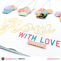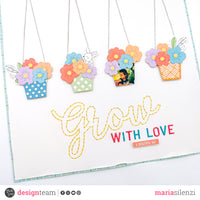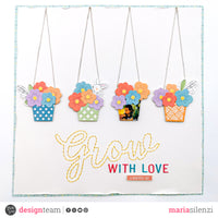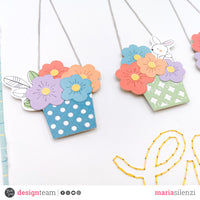 Per i vasi ho utilizzato tre carte della collezione Bunny Kisses, mentre per i fiori quattro diverse carte monocromatiche. Ho aggiunto qualche die cut e incollato, spessorandoli, i quattro vasi alla metà del layout, creando con un filo grigio delle corde che li sorreggono.