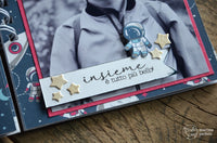 Le altre decorazioni le ho ricavate da diversi set, sia di timbri che fustelle, compresi i pianeti e la luna, creati con l'aiuto del set "Dashing Circles", uno dei miei preferiti perché estremamente versatile! Ho poi deciso di sfruttare livelli e trasparenze con il vellum per completare le pagine e creare delle simpatici finestrelle sulle foto.