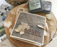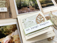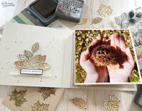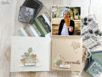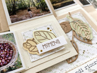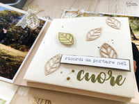 Ho decorato l’interno del mio mini con foto quadrate e tante foglie timbrate e fustellate. Ho giocato con lo *Special paper garzato* trasparente per realizzare foglie e banner. I *Dashing Squares* si adattano perfettamente a questa struttura dalle paginette quadrate. Ho infine creato i miei sentiments timbrando le frasi del bundle e gli *Stickers Typewriter* sono davvero versatili, li possiamo usare per ogni occasione. Qualche gocciolina qua e la fatta con i Distress, danno quel tocco in più.