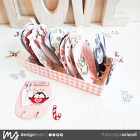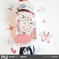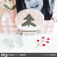 A questo punto ho decorato le pagine usando le fustelle “Reindeer”, “Gingerbread”, “Snowman”, “Fluffy Xmas” e i Die Cut “Traditional Christmas”. Per il fronte della scatola invece ho scelto la fustella “Snow Globe” con la scritta “COLD DAYS”.