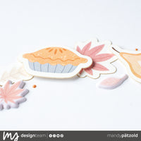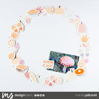 Per questo layout, ho disegnato un cerchio utilizzando un piatto e una matita e vi ho disposto sopra le bellissime die cut e i puffy stickers della collezione Autumn Vibes.