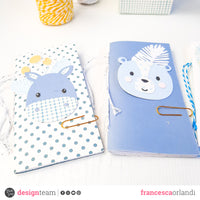 Per fare i libretti ho usato 4 pezzi di cartoncino per le copertine, Carta Duoble Face Pastel Sky e Cartoncino Woodstock Bianco, da 11,6 x 10,5 cm (piegando a metà il lato 11,6) e per le pagine ho stampato dei fogli bianchi a quadretti e a righe (sul web si trovano tanti template da scaricare e stampare gratis) li ho tagliati a 11,4 x 10,3 cm e li ho piegati a metà. Una volta infilate la pagine dentro alle rispettive copertine ho praticato due fori su ciascun dorsino e ho usato del filo per rilegare i quadernini.