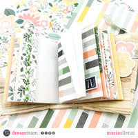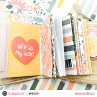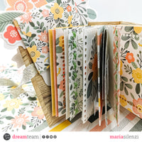 Ho sfruttato poi il dorsino per incollare le pagine 6x9 cm del mini album, per le quali ho utilizzato il pad 6x6 “Happy flowers”. Prima di fissarle alla copertina ho però decorato la maggior parte della facciate con la fustella “Creative rectangles” che ha creato un effetto particolare. Con una parte della fustella “Spring basket” ho invece creato delle taschine, mentre con la fustella “Deco lines” ho potuto cucire, in modo decorativo, un paio di facciate.