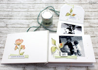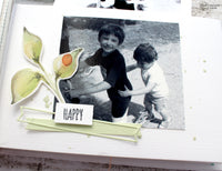 Oltre che sgocciolandoli qua e là, li ho usati puri anche per colorare i *Banner* che decorano le fotografie e per creare le foglioline charms (Stencil Friend) che ho messo sul dorso della copertina.