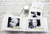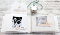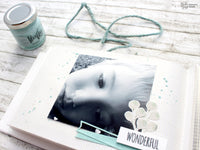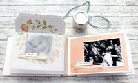 Le pagine sono realizzate con bazzill bianco, con *Vellum* e con la *Special Paper Garzata Bianca*. Sono tutte delle “tasche” (ho usato i fogli 30,4 x 10,3 piegati a metà e li ho lasciati aperti sopra e sotto) in cui ho inserito delle tag. Ovviamente per la rilegatura ho usato la fantastica fustella *Scoring Binder*.