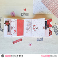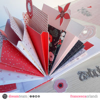Le pagine sono in realtà delle tasche e per realizzarle ho usato le carte 15,2 x 15,2 cm e le carte double face Wild Flowers 06 , Pastel Pink, Pastel Strawberry. Ho piegato a 0,8 – 1,6 – 2,4 sia sul lato destro che sul lato sinistro creando un soffietto. Ho ruotato di 90° e ho piegato a metà (7,6 cm). A questo punto ho tagliato lungo le pieghe di 2,4 cm (entrambe le pieghe) fermandomi dove incontro la piega della metà. Ho piegato lungo la metà e ho incollato il soffietto.