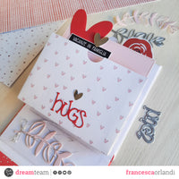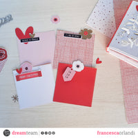 Con la fustella “Dashing Circles” più piccola ho creato la fessura a semicerchio su ogni pagina. La tasca finita misura 10,4 x 7,6 cm. Ne ho create 9: una andrà attaccata sull’interno della copertina a sinistra mentre le altre 8 vanno incollate una all’altra e poi fissate all’interno della copertina a destra. Con la fustella “Dashing Squares” (misura 9,5x9,5 cm) ho creato i cartoncini su cui attaccherò le foto e li ho infilati in ogni tasca. Ho abbellito aggiungendo i “Sentiment Strips Xmas Wishes Black”, i Die Cut “The Magic of Christmas” e alcune fiori della fustella “Flower Mix.