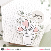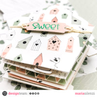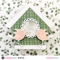 Realizzarlo non è stato affatto difficile: ho tagliato con la fustella “MY HOME BIRD HOUSE ADD-ON” due pezzi di cartone vegetale, li ho rivestiti con la carta verde della collezione “Love is in the air” e li ho uniti ad un dorsino posizionato su un lato del tetto; ho fustellato più volte il cerchio merlettato per avere uno spessore che mi permettesse di creare un effetto shaker con l’acetato “Spring poppies 1”; ho decorato la copertina con i simpaticissimi uccellini della fustella “Love is in the air”; per tagliare le pagine interne ho utilizzato il pentagono della fustella “my home”; ho decorato le facciate con i rub on “love is in the air” , i die cut “Love is in the air” e la fustella “LOVE BRANCHES”.