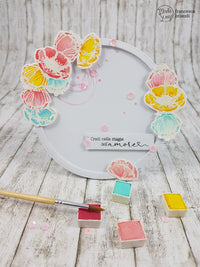 Per realizzarla, prima di tutto, ho creato la struttura della card usando le fustelle Dashing Circles, poi ho timbrato ed embossato i papaveri con polvere da embossing bianca e infine mi sono divertita a colorarli usando i miei amati acquarelli! Qualche paillettes, filo ed enamel dots sparsi qua e là e il gioco è fatto!