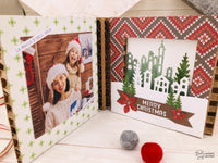 Per le finestre della parte centrale ho voluto utilizzare la fustella Christmas Landscape, è splendida ed ha una resa incredibile. Ho fustellato le sagome delle case su carta glitterata verde e su fommy bianco attaccandolo su due diversi spessori per dare tridimensionalità alla creazione e ho poi utilizzato i fiori contenuti sempre nella stessa fustella per decorare anche l’altro quadrato.