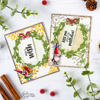 Le carte che ho utilizzato fanno tutte parte del pad Forever Green 6x6". Ho ottenuto i pannelli focali fustellando due diversi design con le *Dashing Rectangles* e li ho poi decorati con lo stencil *Snowflakes* e i *Gelly*. Ho distribuito il Gelly nel colore Silver su una delle card e ho usato il Gold sull'altra. Volevo differenziare un pò i progetti tra di loro e dovevo assolutamente provare entrambi i nuovi colori!