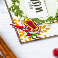 Ho timbrati gli gnomi su del cartoncino bianco liscio e li ho colorati con i miei pennarelli Illustrator. Ho fustellato lo gnomo dal set Time to Celebrate con le fustelle in coordinato e ho ritagliato l'altro gnomo a mano (non ci sono invece fustelle per il set Chariot of Joy)