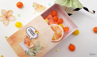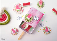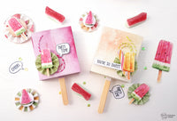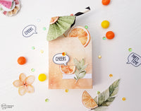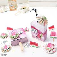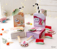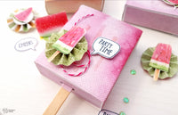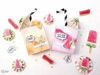 Dopo aver assemblato le scatoline, vi basterà inserire nella fessura o una cannuccia per farle diventare dei cocktail oppure un bastoncino di legno per trasformarle in colorati ghiaccioli. Per restare in tema ho usato i timbri fatti tipo a fumetto del set *Party Time* e la scritta “You’re so sweet” del set *Postage Summer*. Poi aggiungete fettine d’arancia, spicchi d’anguria, ghiacciolini ritagliati dai fogli pattern e il gioco è fatto! Riempitele di caramelle e che la festa abbia inizio!
