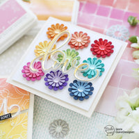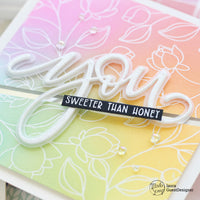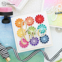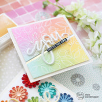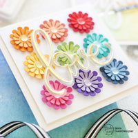 Per la card con i fiori ho fustellato la *Zinnia* con diversi cartoncini colorati tinta unita e, quando ho composto il fiore ho aggiunto al centro una *Semi pearl* nella versione Clear. Per il sentiment ho tagliato con la fustella *Big Love* sia il vellum che del foil oro e li ho attaccati uno sopra all'altro. La base poi è stata montata su una card color crema.