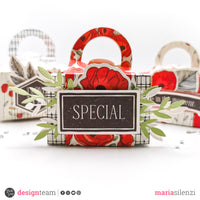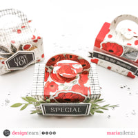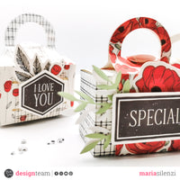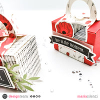 Personalmente adoro il contrasto fra il bianco, il nero e il rosso! Carte e die cut che si sposano perfettamente con la fustella “Weave Basket”, che mi ha permesso di realizzare questa scatoline dallo stile romantico, perfette come segnaposto per una cena a lume di candela, un anniversario o come mini confezione regalo.