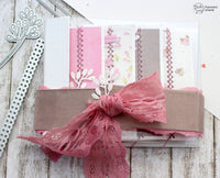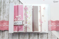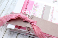 L’album è tenuto chiuso da un nastro di pizzo infilato nelle fessure (fustella *Tab Set*) realizzate su due *Flags*. La trovo una soluzione veloce e funzionale: le “codine” del banner si incastrano perfettamente e i due tagli, fatti con la fustella, permettono di poter usare sia dello spago o nastri sottili, sia del pizzo più grosso come quello che ho usato io.