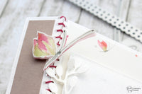 Per gli abbellimenti ho usato le fustelle *Ramo 2*, *Banner*, *Flags*, *Tab Set*. Ho poi aggiunto gli stickers *Sentiments Typewriter* e qualche timbrata del set *Album*.
