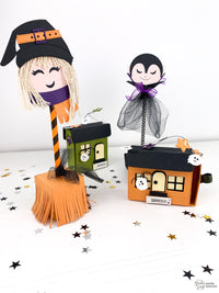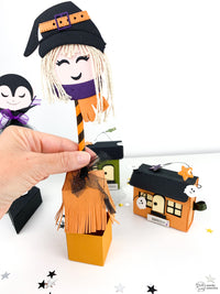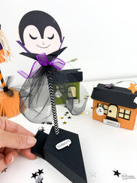 E ora passiamo alla strega per la quale vi servirà la fustella *Santa* e Santa’s friends*, basterà fustellare il cappello di Santa in nero, per farlo diventare il cappello di una strega e con la *Matchbox suitcase add-on* ho fatto la piccola cinghia. Trattandosi di una strega, non poteva mancare la scopa magica, realizzata con una cannuccia di carta, la fustella *The cube* e una striscia colorata che ho tagliato creando le setole della scopa.