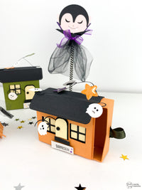 Con il rettangolo contenuto nello stesso set, ho fustellato la parte esterna che ho attaccato al coperchio con il biadesivo spessorato. Per la finestra ho usato la fustella *Candy Box House Add on*. Dalla fustella *Santa* ho usato il filo di luci con le stelle e con il pom pom del cappello di Babbo Natale ho creato i piccoli fantasmi.