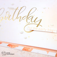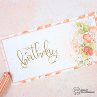 Innanzitutto ho usato un inchiostro pesca steso con un pennello e qualche macchiolina oro su un angolo della base della card (10,5x21cm); sono passata alla timbrata, che ho poi embossato con una polvere da embossing dorata. Avete visto che bella la scritta "happy birthday" con lo stile calligrafico?
