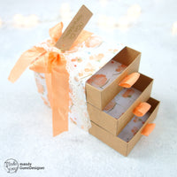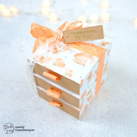 Per la scatola ho tagliato tre volte la scatolina e assemblata una sull'altra per creare una specie di piccola cassettiera che potesse contenere per esempio: un dolce, un palloncino, una piccola candela e un gioiello..
