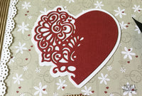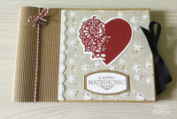 La struttura dell’album è realizzata con una rilegatura a spirale, ricoperta con del cartoncino ondulato. Ho decorato poi la copertina con la Fustella Cuore. Trovo questa fustella perfetta, raffinata, che da sola impreziosisce la copertina. Per darne ancor più effetto ho applicato sotto al cuore, un cartoncino bianco e l'ho sagomato, lasciando 1 cm di bordo. Nella parte bassa della copertina ho aggiunto il timbro della linea Cerimonia e il gioco è fatto!