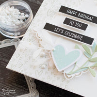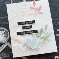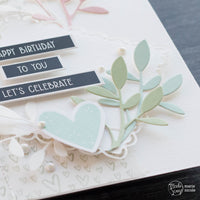 A questo punto, ho aggiunto un quadrato bianco fustellato con la *Scallop squares*, e alcune fustellate realizzate con il set *Rametti* e qualche carta dai colori soft della linea *Pastel colors*. E' stato davvero molto semplice aggiungere qualche decorazione con le die cuts della linea *New Baby* e le *Sentiment strips*.