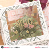 La scatola esterna è realizzata con la collezione *Happy flowers*, e siccome finalmente i nuovi Rub on sono usciti, ho deciso di aggiungere un tocco metallizzato sull'acetato usando i *Rub-on make a wish* insieme ad un micro glitter color oro.