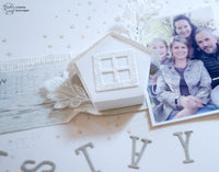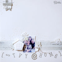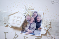 Per la realizzazione di questo layout ho scelto ancora una volta "il tono su tono", giocando con i bianchi/grigi. Ho creato per prima cosa uno sfondo con lo *Stencil Snow* usando il *Fluffy Old Linen*. Con la fustella *Candy Box* ho fatto una scatolina che ho trasformato in casetta usando il set * Candy Box House Add-on*, è adorabile non credete anche voi?