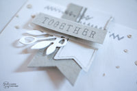 Su *Vellum*, ho timbrato alcuni rametti del set *Primula* di Tommy, anche in questo caso ho scelto di embossare a caldo con la polvere bianca, per rimanere sul tono dei bianchi. Ho fustellato in cardstock grigio le letterine dell’alfabeto con il *Funny Alphabet* e ho usato le lettere del *Calendar* per scrivere “Together”.