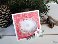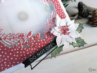 La misura del coperchio della scatola è di 13,5x13,5 cm e prima di assemblarlo l’ho fustellato al centro con la “Winter Frame”. Poi ho fustellato un quadrato, fustellato con la “Dashing Square”, sempre con la fustella Winter Frame; li ho incollati insieme con il biadesivo spessorato. All’interno ho incollato del vellum, spessorandolo, per avere quell’effetto vedo non vedo. Sull’angolino del coperchio ho decorato con una Stella di Natale fustellata con la “Winter Greenery” e le foglioline le ho ritagliate dalla patterned n°12 della collezione “Christmas Italian” e fustellato la scritta con la fustella “Banner”.