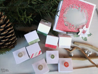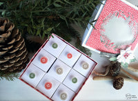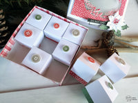 All’interno della scatola ho inserito 9 scatoline fustellate con “The Cube” e sul forellino del coperchio ho incollato un pezzettino di biadesivo spessorato per poi incollarci sopra un bottone ritagliato dalla patterned. Ogni scatolina ha la base di colori diversi usando tutte le patterned coordinando le carte ai bottoni rossi, verdi e beige.