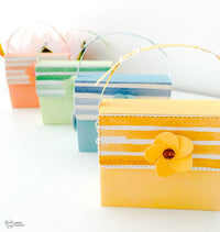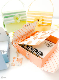 Per realizzarle ho usato le carte *Double Face a pois* e la nuovissima carta *Wooden Colors* che si abbina perfettamente. Ho fustellato gli elementi della base della Matchbox che ho incollato a quello che dovrebbe essere il coperchio, lasciando uno dei due lembi libero a cui ho attaccato due rettangoli con le impunture «effetto cucito»: uno nella parte esterna e l’altro nella parte interna.
