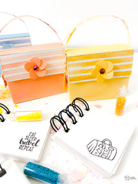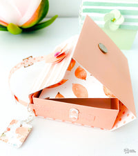 Tra i due rettangoli ho nascosto una calamita. Con la fustella *Matchbox Suitcase Add-on* ho creato la cinghia della pochette. Per decorarla ho usato il fiore più piccolo della fustella *Frangipane Flower* e le piccole tag che si trovano nel set Matchbox Suitcase Add-on.