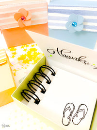Come regalo all’ interno, ho preparato nei mini book che ho decorato con il set di timbri *Thanks*, *Postage Summer* e *Postage Travel*. Dai paper pack *Spring Flowers*, *Crazy Summer* e *Shades of Love* ho ricavato dei pezzi da 14 x 7 cm che ho cordonato a 6 e 8 cm e che ho usato come copertura dei mini book.