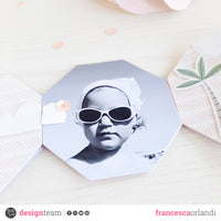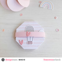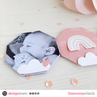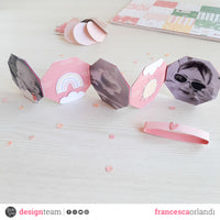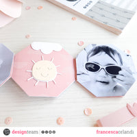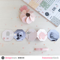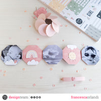 Per la busta ho optato per un tono di rosa della “Color Palette” 6 x 12 cm e il verde chiaro per la foglia. Per il mini album ho usato il Paper Pack “Hello Sweet Girl” 6 x 12 cm. Per gli abbellimenti ho scelto di usare sia i “Die Cut Hello Sweet Girl” sia le fustelle “Boys & Girls” e “Welcome”.